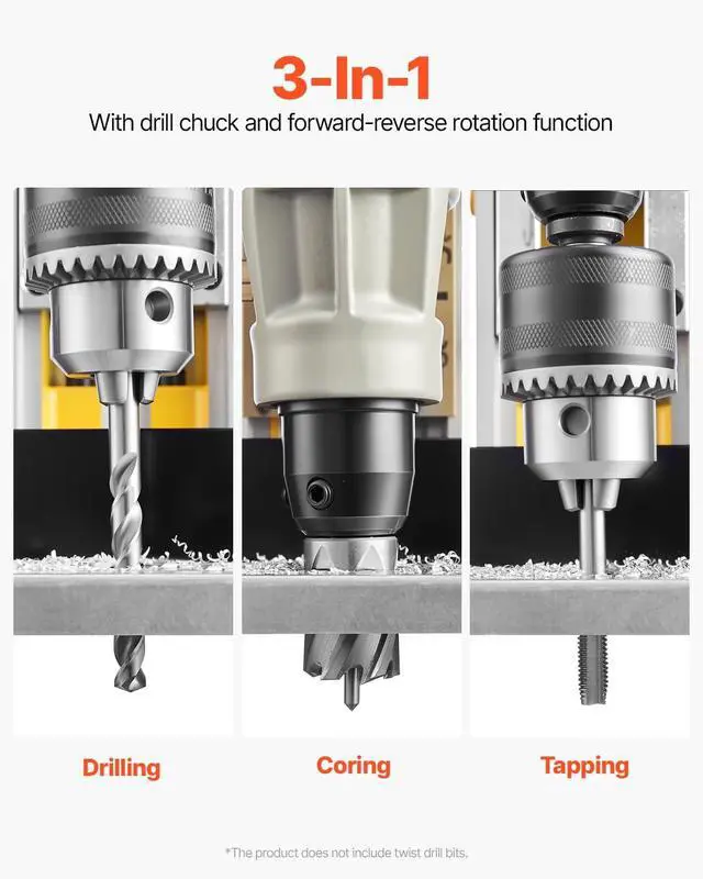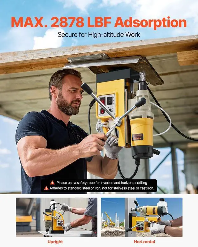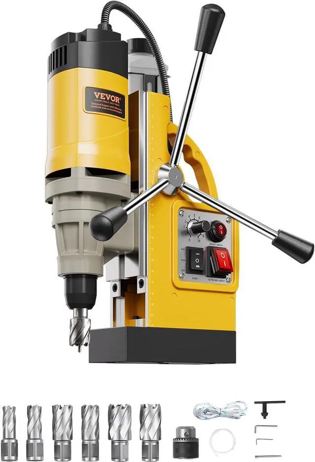 VEVOR Magnetic Drill, 1450W Motor 2 in Boring Diameter, 2878 lbf Electric Mag Drill Press, with 6 Coring Bits, Variable Speed, Drilling Machine for Metal Surface, Home Improvement Industry, Yellow