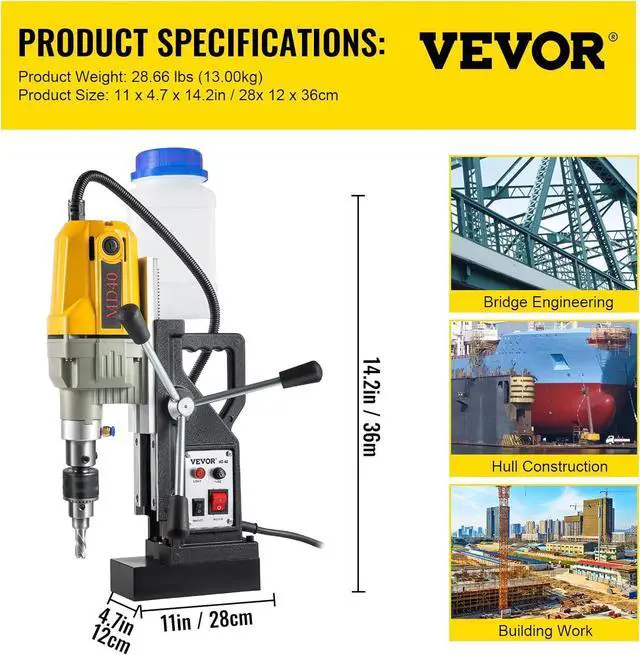 5. Wide Applications: This versatile magnetic drill plays a vitally important role in home improvement, equipment installation, industrial and steel fabrication, ship and bridge building, railway manufacture, windmill & power-plant construction, and many other fields. Note: Ensure optimal use by adhering to a steel plate thickness of 0.39 in / 10 mm. Not suitable for stainless steel or cast iron. Pleas