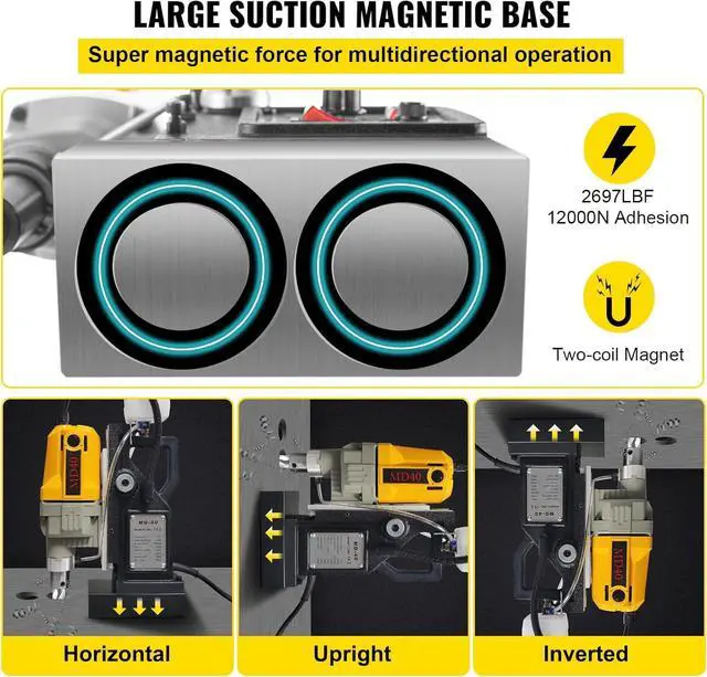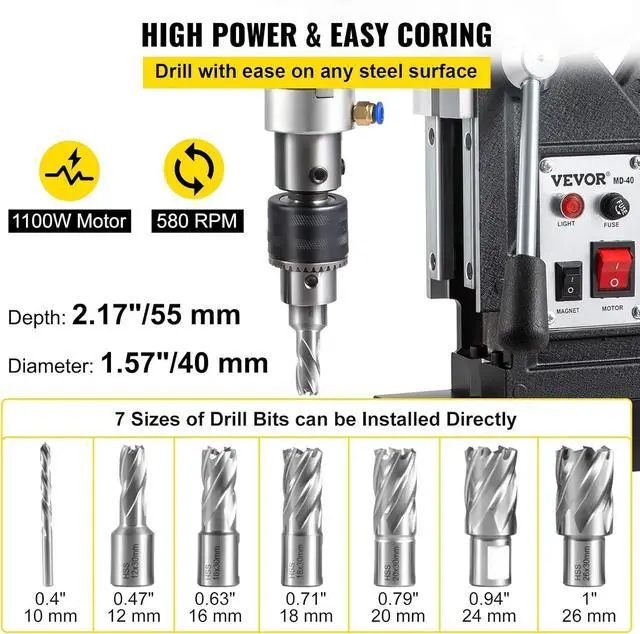 1. Top-level Magnet: Get ready for unstoppable power! Our electric mag drill generates exceptionally powerful driving force with its 1450W copper motor. It is capable of drilling into the toughest material at 0-800 RPM. Max. Boring Diameter (Coring Drill): 1.6 in / 40 mm; Max. Coring Depth: 2 in / 50 mm