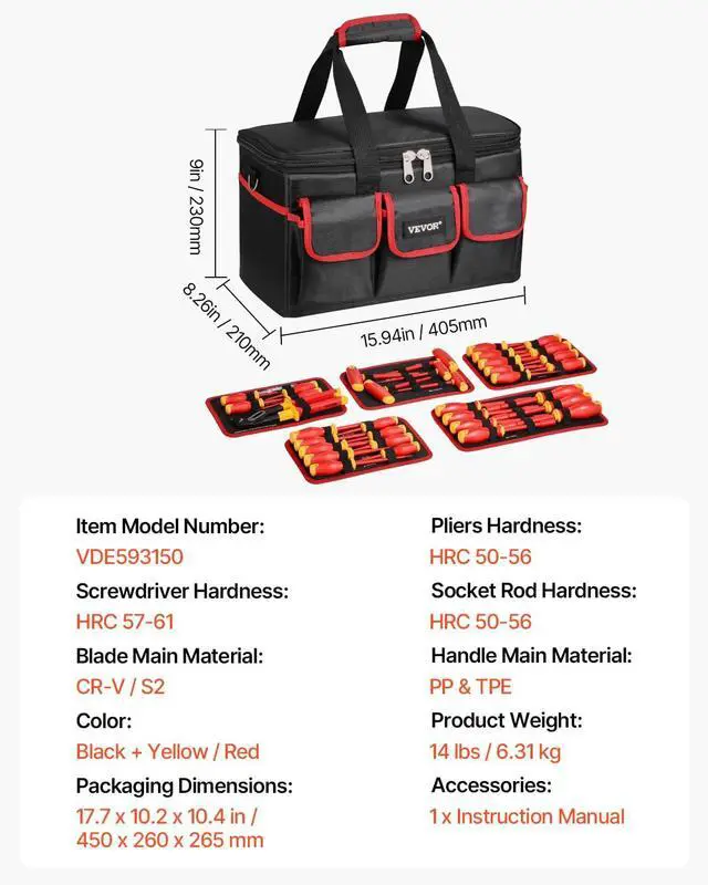 Large Capacity Tool Bag: The 16 in / 410 mm large-capacity bag for the insulated tools has ample storage space and a comfortable handle design, providing users with unmatched convenience and portability