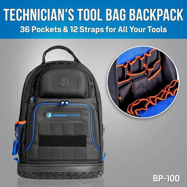 48 POCKET BACKPACK: The Technician's Tool Bag Backpack boasts 36 organizer pockets and 12 pocket straps, providing a secure home for all your tools.