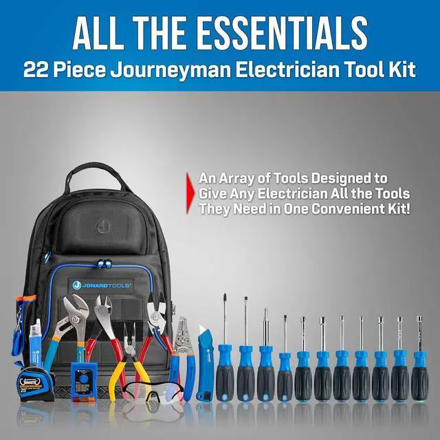 COMPREHENSIVE 22-PIECE KIT: This kit includes a wire stripper, 7 nut drivers, a 6-in-1 multi-bit screwdriver, 4 types of pliers, a tape measure, 3 screwdrivers, GFCI outlet tester, non-contact dual-range voltage detector, utility knife, technician's safety glasses, and a backpack for easy transportation