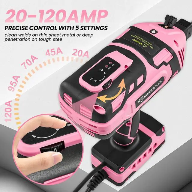 POWERFUL 20120 AMPS WELDING OUTPUTSakerPlus welder offers a flexible current range of 20 to 120 amps, with a 5-position rotary dial for quick adjustments based on rod size or metal thickness. Ideal for stainless steel, mild steel, iron, and more tackle welding jobs in auto repair, construction, maintenance, or fencing with confidence. SakerPlus provides a powerful solution in a small welding machine for both home improvement and professional-grade work.