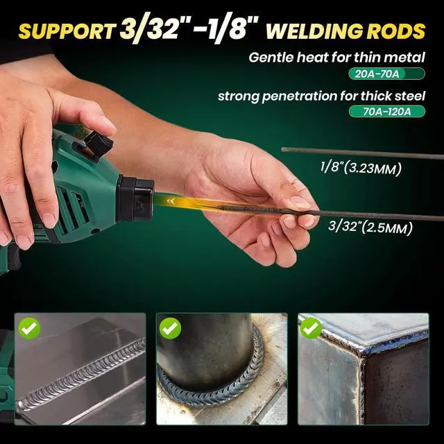 4. SUPPORTS MULTIPLE ROD SIZESCompatible with welding rods from 3/32" to 1/8" (2.53.2mm), sakerplus stick welder gun adapts to a wide range of materials and tasks. The built-in hot start feature ensures reliable arc ignition, while the anti-stick function prevents rod adhesion, keeping your workflow smooth and frustration-free. Whether you're working on machinery, gates, or home repairs, it offers flexible and stable welding support.