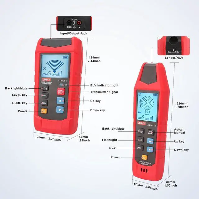 Package IncludedComes with 1 UT25CL wires tracer set, includes 1 outlet tester, 1 circuit breaker finder, 1 pair of dual direct-plug test line (red + black), 1 pair of alligator clips (red + black), 1 pair of connected penlight lantern head probe (red + black), 1 AC polarity plug line, 1 auxiliary grounding nail, 1 manual, 1 certificate of conformity, 6pcs 1.5V AA alkaline batteries, 6pcs 1.5V AAA alkaline batteries, 1 sturdy EVA tool case and 5 months warranty for transmitter and receiver.