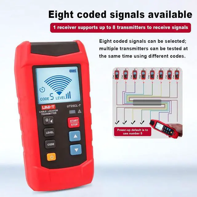 8 Coded Signals & 8 Languages8 Coded signals(0~7) available. 1 receiver can support up to 8 transmitters to receive signals. Multiple transmitters can be tested at the same time using different codes, which is convenient and saves time. Support 8 languages display: English, French, German, Italian, Spanish, Swiss, Polish and Czech.