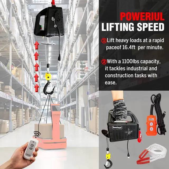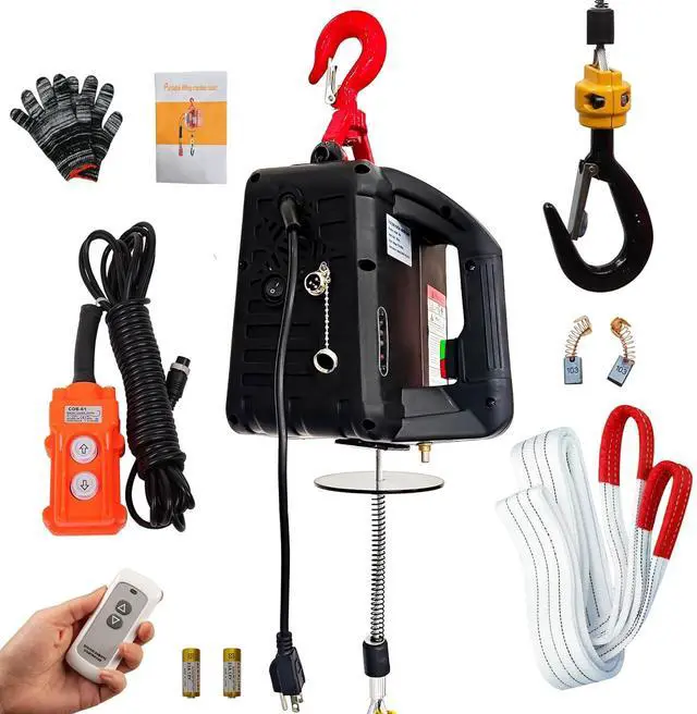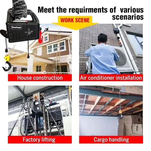 WIDE APPLICATIONS: The power hoist widely used in garages, factories, warehouses and homes,construction sites,carmakers,railway construction,as well as by professionals and hobbyists.This garage lifting machine can easily lift small engines, transmissions, large workshop tools, or construction supplies,suitable for repairing boats, cars, lawn mowers, golf carts, home decor, engines, boulders, trees, etc.