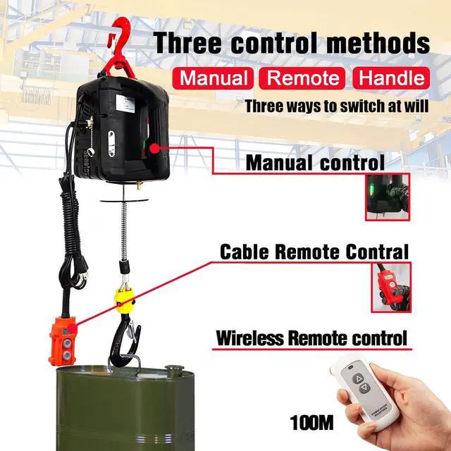 2-IN-1 HOIST WINCH: Two intelligent control methods: 98ft wireless remote control and wired remote control.The 2in1 electric hoist is designed to meet your needs for lifting items over long distances. This wireless remote control provides an excellent switch feature, you can operate the winch to lift, place and lower the equipment without someone else's assistance, which eliminates the dependence on being tied to the hoist.
