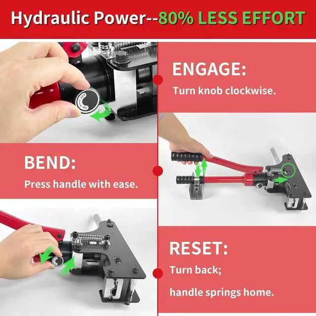 Intuitive 4-Step Operation & Durable BuildMaster the tool in moments with its 4 process: 1) Position conduit, 2) Engage hydraulic system with a clockwise switch turn, 3) Press the handle smoothly to bend, 4) Disengage (counter-clockwise) for automatic reset. Crafted from high-strength materials and precision hydraulic components, this bender is built for enduring performance, making it a trustworthy and long-lasting choice for professional electricians, contractors, and dedicated DIYers.