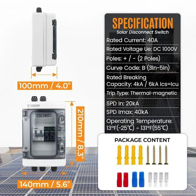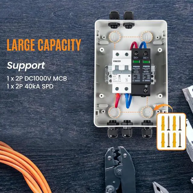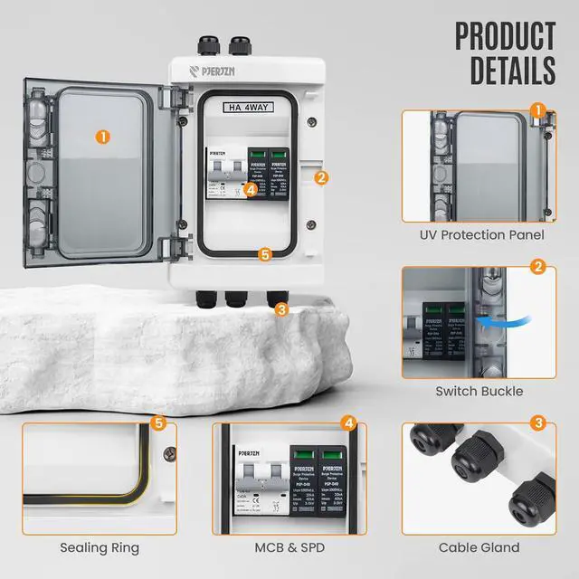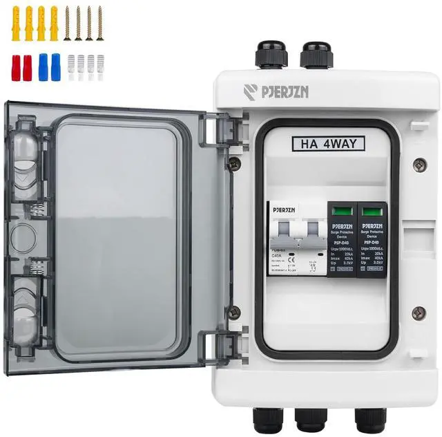 Double Safety, Zero Compromise: Each PJERJZN combiner box is pre-loaded with 1000V DC 40A mini circuit breakers (MCB) and 20-40KA surge protectors (SPD) no cheap fuses! The dual-protection system instantly cuts off overloads/short circuits and blocks lightning surges (up to 40kA), 4X safer than basic 500V boxes