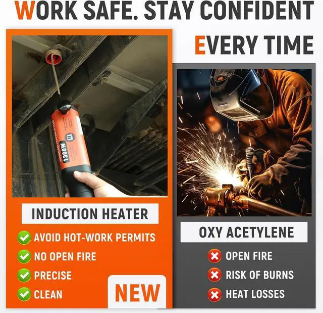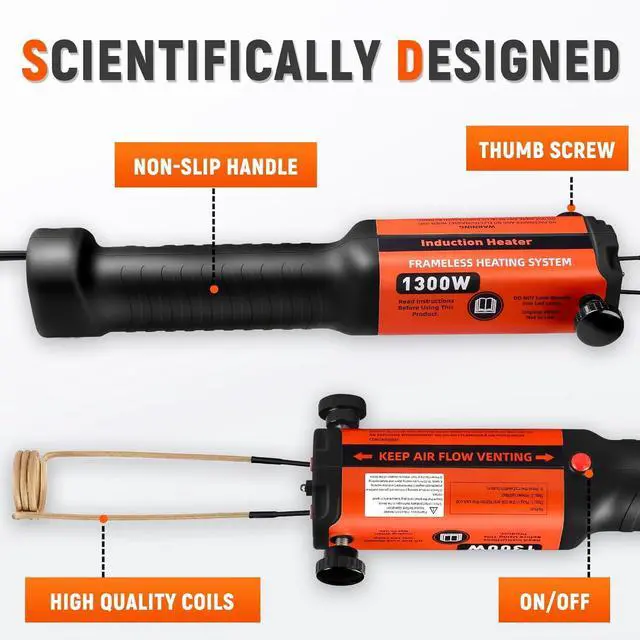 1300W Heating EfficiencyInduction heater bolt removal tool by using the eletromagnetic fields to heat the metal, 25S fast heating, which is faster and more precise and efficient than oxy-acetylene system. 1300w 110v induction heating tool do not flame is generated during heating, ensuring your work safety.