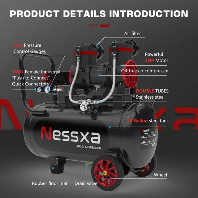 10 GALLON AIR COMPRESSOR: This heavy-duty air compressor features a compact 10-gallon tank paired with a powerful 2HP, oil-free motor. Operating at 110V and 3450 RPM, it delivers a robust 8.76 CFM at 115 PSI for continuous tool operation. The advanced dual-cylinder system, equipped with high-temp resistant silicone intake tubes and a stainless-steel braided mesh, ensures efficient and durable performance for demanding tasks.