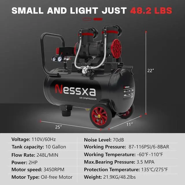 HIGH PERFORMANCE: The oil free air compressor is made of an anti-rust and wear-resistant layer, plastic powder adhesion layer, and Q235B structural steel, which makes the air compressor have a longer service life. 2HP pressure tank provides adjustable air pressure in the range of 0-115PSI, and it only takes 70 seconds to fill the empty tank to the maximum pressure.