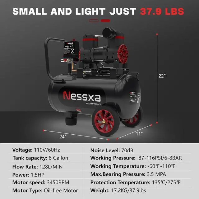 HIGH PERFORMANCE: The oil free air compressor is made of an anti-rust and wear-resistant layer, plastic powder adhesion layer, and Q235B structural steel, which makes the air compressor have a longer service life. 2HP pressure tank provides adjustable air pressure in the range of 0-115PSI, and it only takes 70 seconds to fill the empty tank to the maximum pressure.