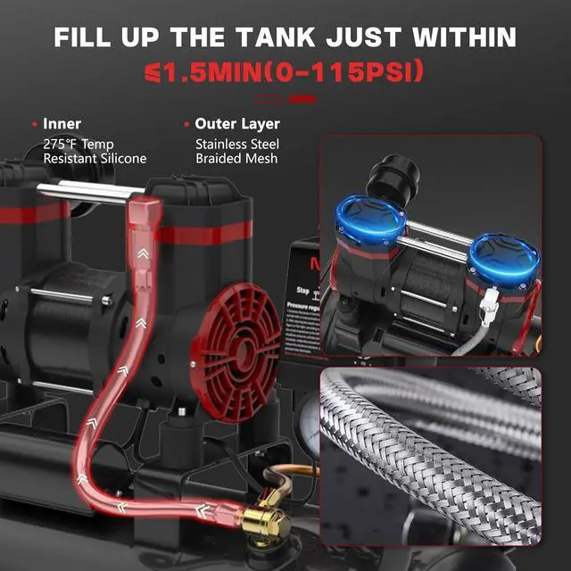 10 GALLON AIR COMPRESSOR: This heavy-duty air compressor features a compact 10-gallon tank paired with a powerful 2HP, oil-free motor. Operating at 110V and 3450 RPM, it delivers a robust 8.76 CFM at 115 PSI for continuous tool operation. The advanced dual-cylinder system, equipped with high-temp resistant silicone intake tubes and a stainless-steel braided mesh, ensures efficient and durable performance for demanding tasks.