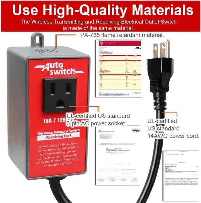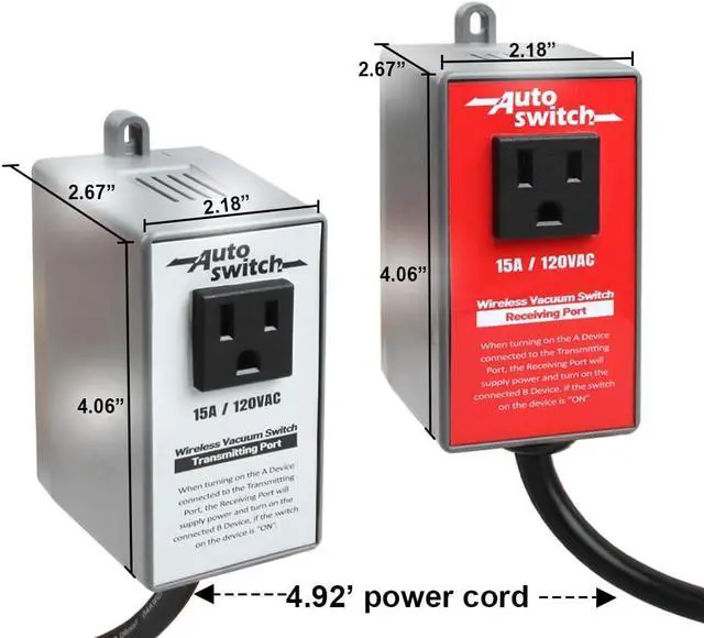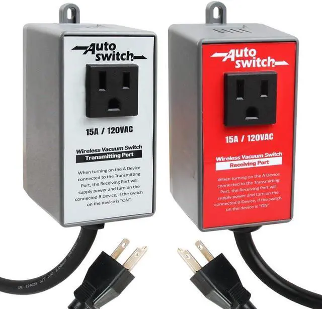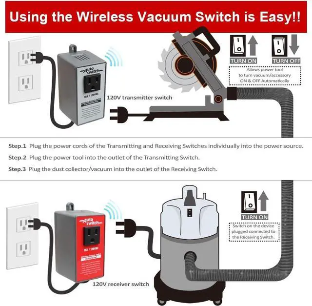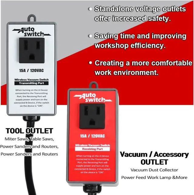 The wireless transmitting and receiving switches are suitable for use with a variety of appliances such as vacuum, dust collector, power feed, work lamp, etc. The distance between the transmitting end and the receiving end can reach 160 feet without obstacles.