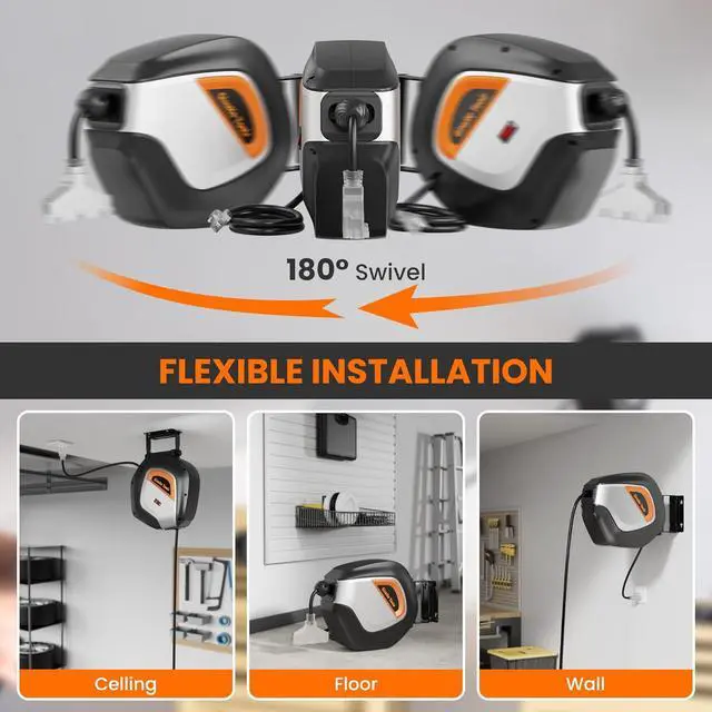Wide Applications: With the 180° swivel bracket, this electric reel can be mounted on a wall or ceiling, helping you keep messy electrical cables out of the way to create a safe work environment