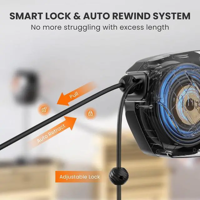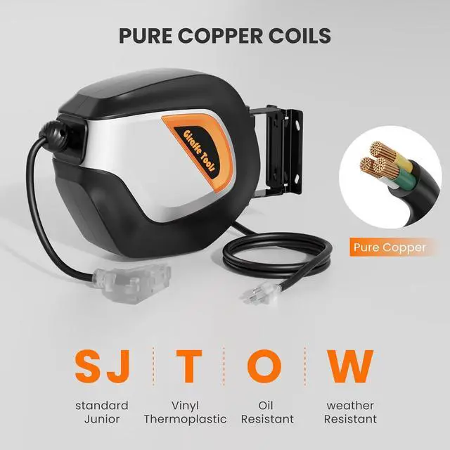 Durable Material: This retractable power cord reel is constructed of hard impact polypropylene enclosed spring-driven case and Premium commercial 3C SJTOW cables are resistant to Acids, Alkalies, Ozone, Water,Oil and Kinking; Operable and flexible in the extreme conditions of -58°F to 221°F (-50°C to 105°C)