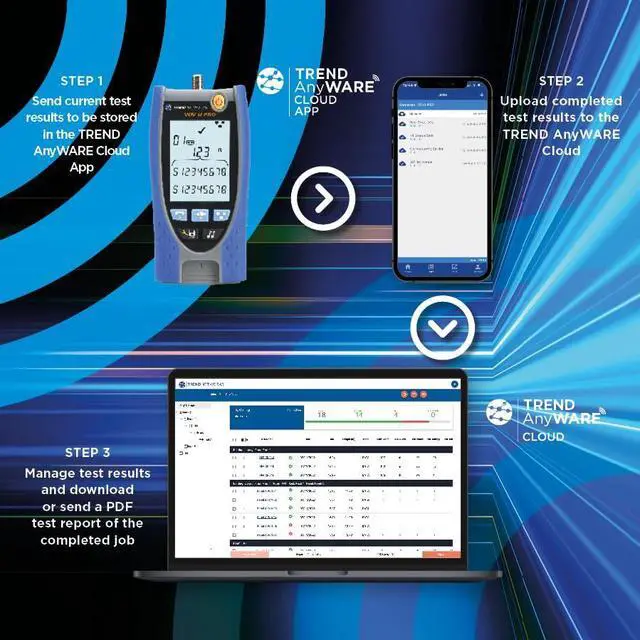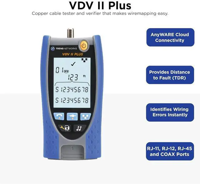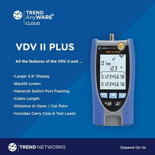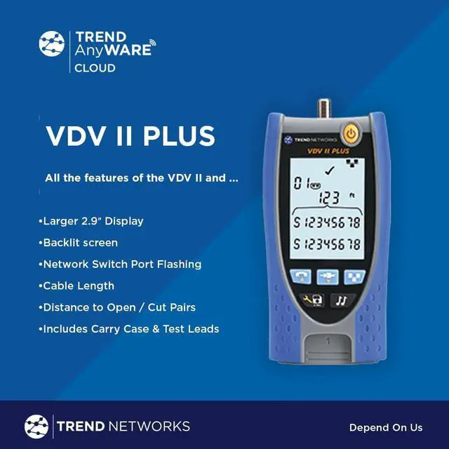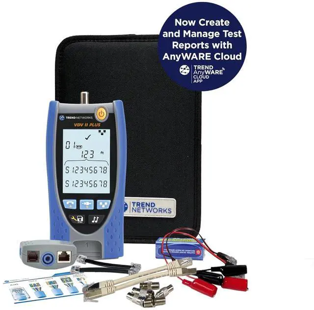 VDV II Basic: VDV II cable testers / verifiers check the integrity of copper cables commonly found in voice, data or video installations, including telephone wiring, data networks and video/security cabling. Provide professional PDF reports effortlessly with TREND AnyWARE Cloud App.
