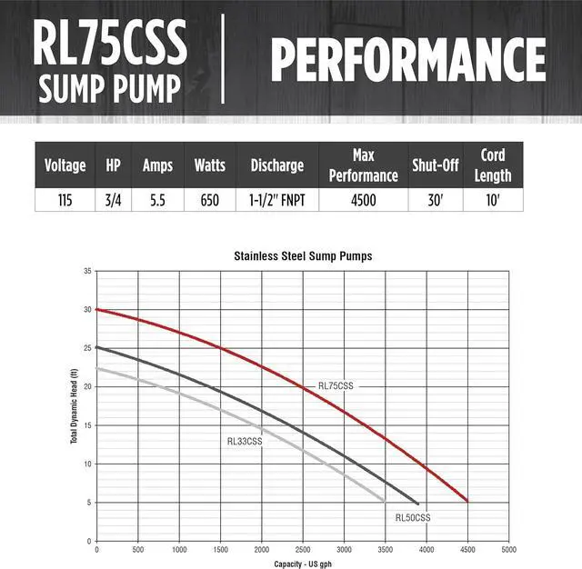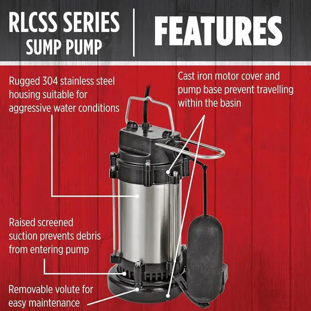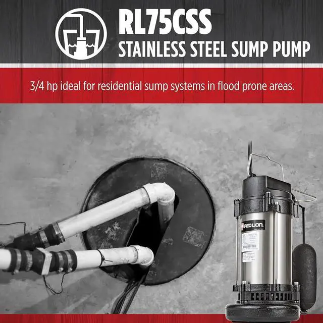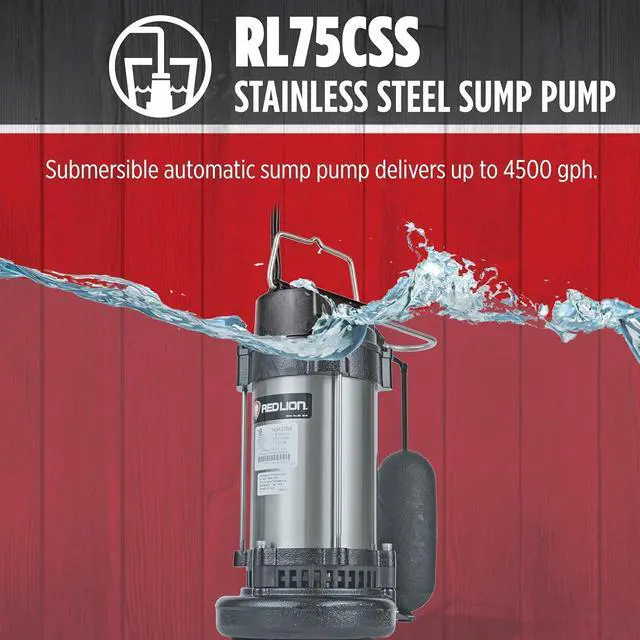 Red Lion RL75CSS 115 Volt, 3/4 HP 4500 GPH Stainless Steel Sump Pump with Snap-Action Switch, Steel/Black, 14942795