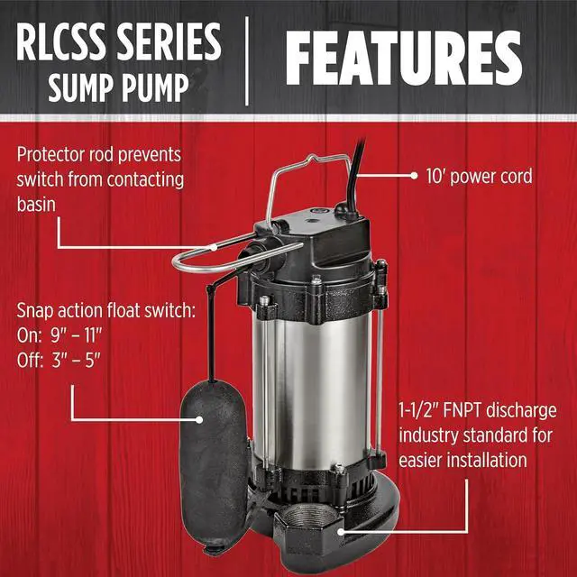 Contractor-preferred snap-action float switch for reliable automatic operation; activates pump when water reaches 9 to 11 inches, shuts off when water falls between 3 and 5 inches