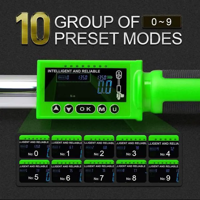 Multi-Mode Operation & Smart Alerts: 3 Modes: Peak Hold (captures max torque), Tracking (real-time monitoring), and Pre-Set (auto-alert at target torque).Dual-LED + LCD Display: Intuitive green/yellow/red indicators for under/within/over-torque, complemented by a backlit screen for low-light visibility.