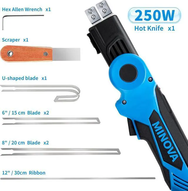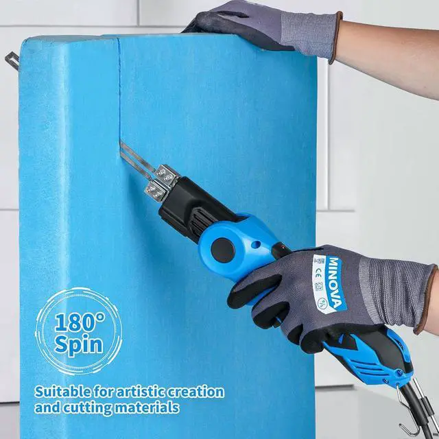 Safety & Use NoticeThe foam cutter is durable, with blades that can withstand high temperatures. The body is equipped with a safety electronic micro-switch to prevent accidents. The MINOVA electric hot knife can work continuously for extended periods and is best used in a well-ventilated environment.