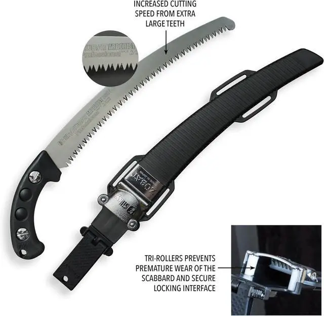 3-roller system that helps guide the saw into the scabbard preventing premature wear on the scabbard