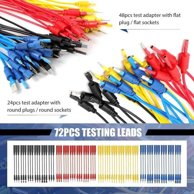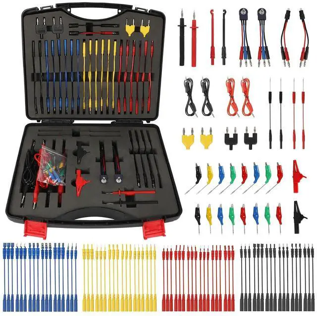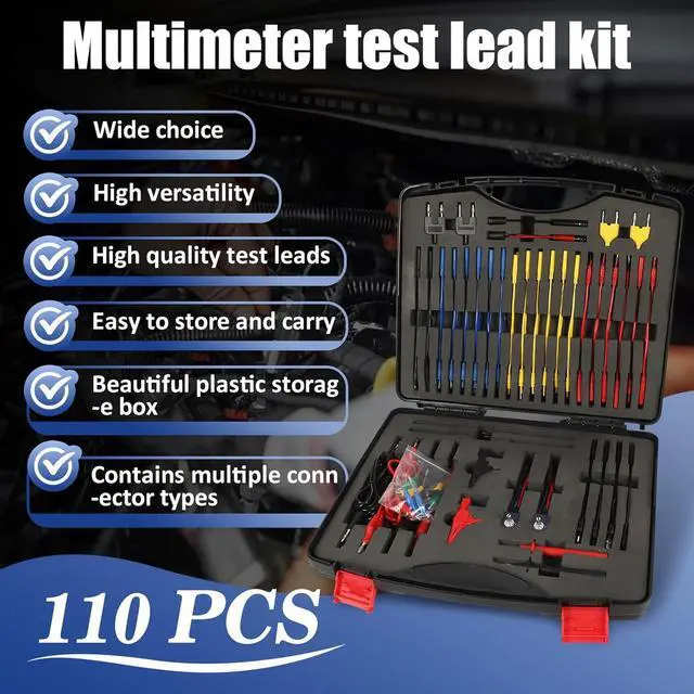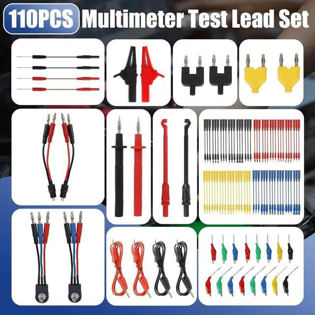 110Pcs Multimeter Test Lead KitThis multimeter test lead set is used to diagnose, test and repair complex automotive circuits. Helps you quickly detect car electrical faults without damaging electrical wiring. Professional test lead kits are compatible with a variety of circuit test equipment. Suitable for cars, RVs, trucks, boats and more, and can also be used in laboratories, homes and industries.