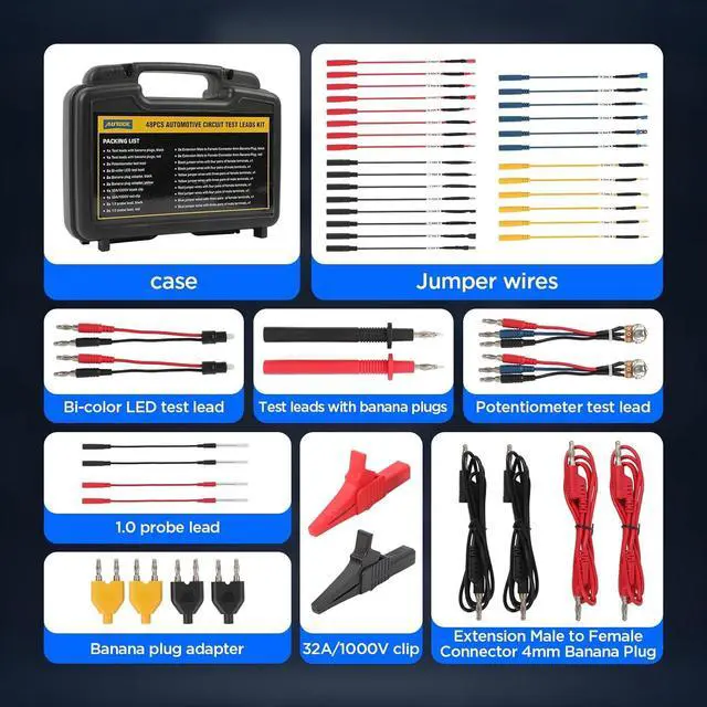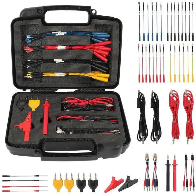 68PCS Multimeter Leads Kit68PCS multimeter test leads kit works perfectly with any multimeter and test instrument. This multimeter leads kit is used to diagnose, test and repair complex automotive circuits. Helps you quickly detect car electrical faults without damaging electrical wiring. Widely used in different measurement environments such as industrial, electronics, home and automotive.