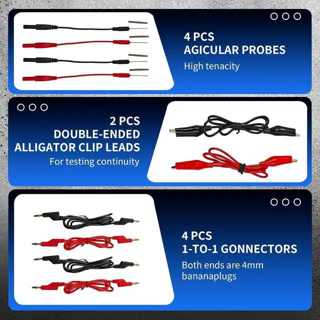 SAFE & DURABLETest leads are injection-molded in one piece from new resin, offering flexibility, durability, and excellent insulation. Features 4mm nickel-plated copper core banana plugs, copper-core flexible leads, and nickel-plated copper core alligator clipsdelivering strong conductivity, low resistance, and zero signal loss.