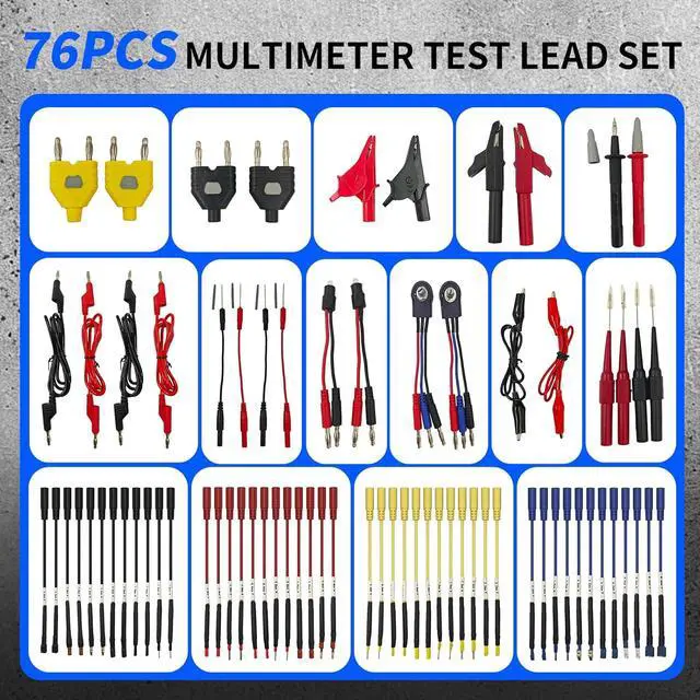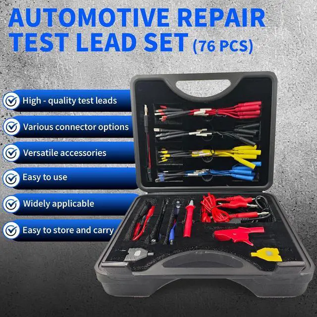 76PCS AUTOMOTIVE CIRCUITS LEAD TEST KITThis multimeter test lead set diagnoses, tests, and repairs complex automotive circuitsquickly detecting electrical faults without damaging wires. A professional set, it works with most circuit testers and suits cars, RVs, trucks, boats, plus labs, homes, and industrial use.