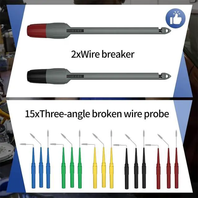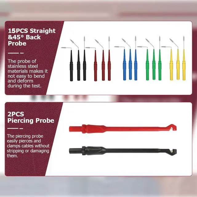 Time-Saving And EfficientCircuit test lead kits assist technicians in quickly and accurately checking for automotive problems, When you need to check parts, you can directly connect to the back of the terminal to avoid damage to the circuit. If you need to check the current, you don't need to cut the wires, just connect the line to the circuit. Facilitates technicians to save time and increase efficiency.