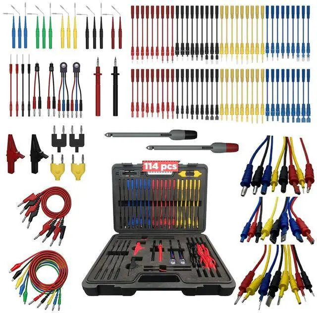 114Pcs Multimeter Test Leads KitAngchun 114-piece test lead kit can be used quickly for adjustment and helps the technician accurately check car problems accurately. Not only for automotive diagnostics, testing and repair, but also in physics labs, workshops, schools, homes and industries. It is an important tool for mechanics to troubleshoot the increasing number of sensors, actuators, electronic circuits and automotive electrical appliances on vehicles.
