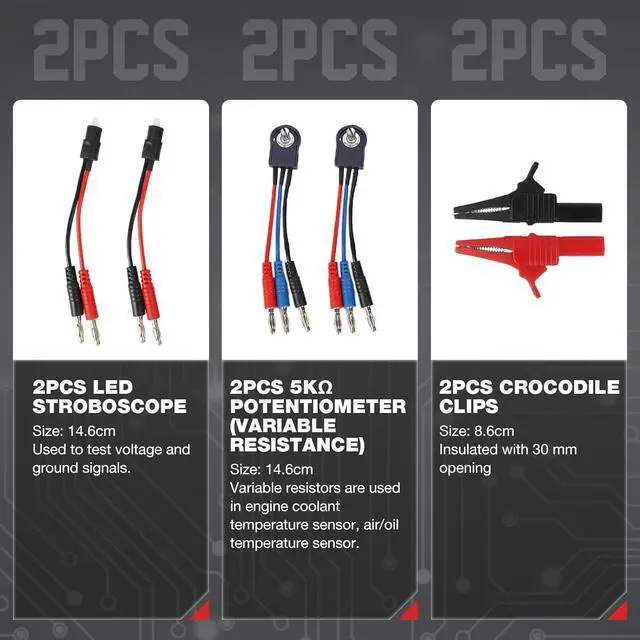 Multi-functional Test KitMultimeter probes leads set have two sets of LED stroboscopes are used to test voltage and ground signals, such as Hall sensors, fuel injectors, solenoid valvesand other actuator control signals; 5KQ potentiometer (variable resistor) is used for components such as engine cooling systems, oil sensors and temperature testers; The SRS connector is used for the electrical simulation of belt tensioner generators.