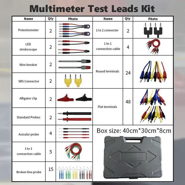 What You GetTerminals x72 (48 Flat Terminals and 24 Round Terminals);2 x Wire Breaker; 15x Broken Line Probes; 2 x Potentiometer (5KOhm); 2 x SRS Connector; 2 x 1-to-2 Connector; 2 x Alligator Clip; 2 x LED Stroboscope; 2 x Standard Probes; 4 x Acicular Probe; 4 x 1-to-1 Connector; 5 x 1-to-1 Connection Cable; 1x Black carrying case.