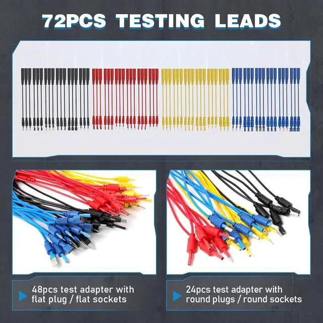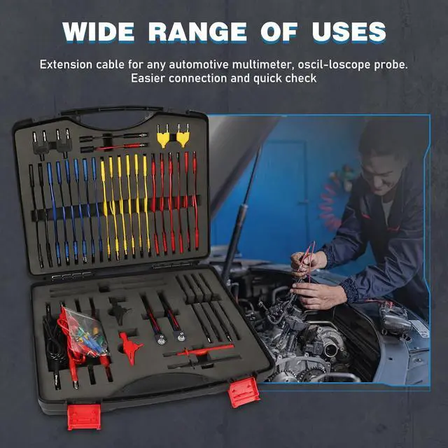 Precision Back Probing & Non-Destructive Testing-The circuit test lead kit is designed to provide a wide range of test coverage to accurately and quickly detect vehicle problems. Standard 4mm banana plug, the rear probes can be easily plugged into automotive connectors and used on wiring harness connectors, fuel injectors, and automotive sensors to avoid the replacement of unnecessary new parts. When you need to check parts, you can directly connect to the back of the terminal to avoid damage to the circuit