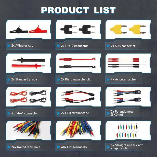 Advanced Safety & Signal Monitoring-Includes 2 SRS connectors to safely simulate airbags and seatbelt pretensioners, preventing accidental deployment during testing. The dual LED stroboscopes provide instant visual feedback for monitoring Hall effect signals, injector pulses, and transmission shift signals, significantly reducing diagnostic time