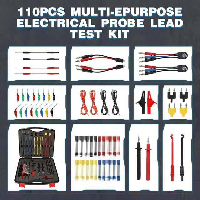 Comprehensive 110-in-1 Master Diagnostic Kit-Upgrade your diagnostic arsenal with this professional 110pcs automotive test lead kit. It includes 72 varied terminals (flat & round), SRS connectors, LED stroboscopes, and high-precision potentiometers. Perfect for mechanics to troubleshoot sensors, actuators, and complex electronic circuits in 12V/24V vehicles, RVs, trucks, and even modern EVs