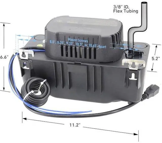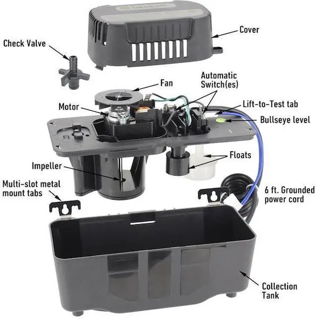 California Proposition 65: This product contains a chemical known to the State of California to cause birth defects or other reproductive harm. New design offers areduced noise level. Includes lid mounted bullseye level for easy installation. Rated for condensate water up to 150 F and high efficiency gas furnaces. Automatic start/stop operation with thermally protected motor. New larger 2.5 quart capacity tank means more water pumped out per cycle so pumps runs less often and last longer.