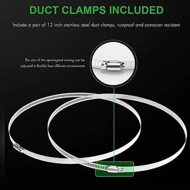 * Premium material: high-quality aluminum foil, high temperature resistant and corrosion resistant, long lasting. PVC thick layer on this ducting can prevent light leaks. Include a pair of 12 inch stainless steel duct clamps