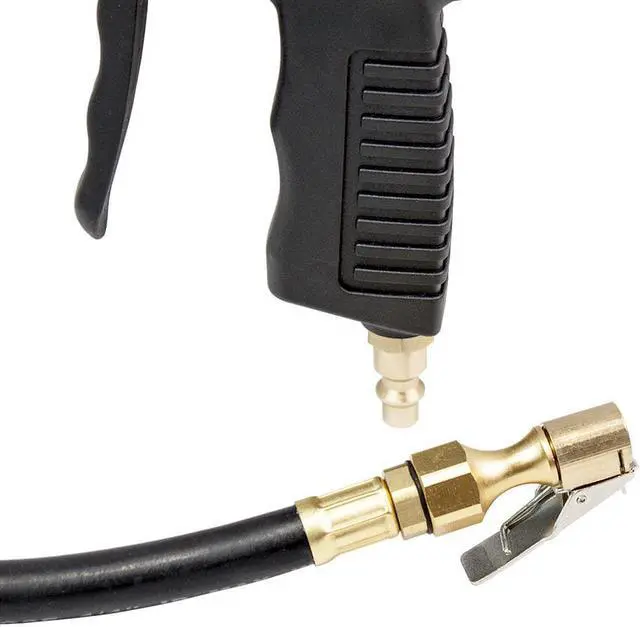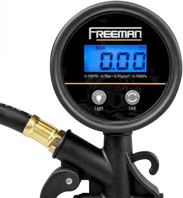 California Proposition 65: This product contains a chemical known to the State of California to cause birth defects or other reproductive harm. The Freeman FS1DTI Composite Digital Tire Inflator with LCD Pressure Gauge makes it easy to check the pressure of your tires frequently, helping you extend the life of your tires and optimize gas mileage. When used in conjunction with a pneumatic compressor, the FS1DTI makes it easy to inflate tires quickly and accurately at home or in the shop. Connect the inflator to your tires using the brass clip-on chuck to measure pressure in increments of 0.1 PSI. The LCD screen is backlit for increased visibility, and you can switch between PSI, kPa, Bar, and Kg/cm² for the most accurate reading. The lock-on brass chuck provides a secure attachment to prevent air leakage, and the 20" flexible rubber hose and swivel hose connector makes it easy to use the inflator in tight spaces. Lightly squeeze and hold the pistol-style trigger at the first position to deflate, or completely depress the trigger at the second position to inflate. The Composite Digital Tire Inflator with LCD Pressure Gauge is constructed of a durable, lightweight composite nylon and rust-resistant fittings to ensure a long product life