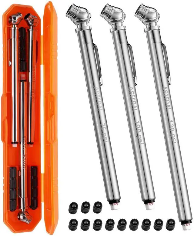 KEHIPI Pencil Tire Pressure Gauge (10-75PSI,100PSI,120PSI), Valve Caps with Case, Stainless Steel Body, and Metal Made Nozzle 3 Measurements for Cars, Bikes, Vehicles