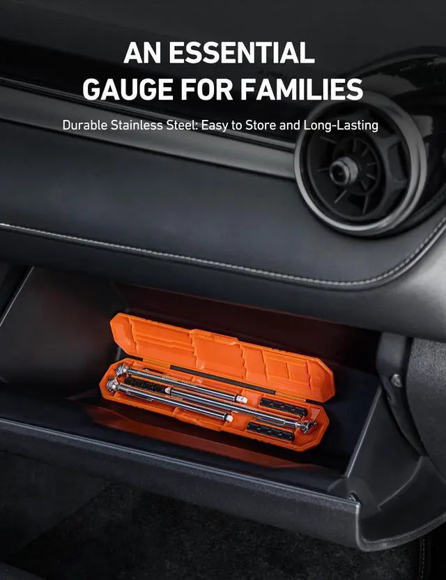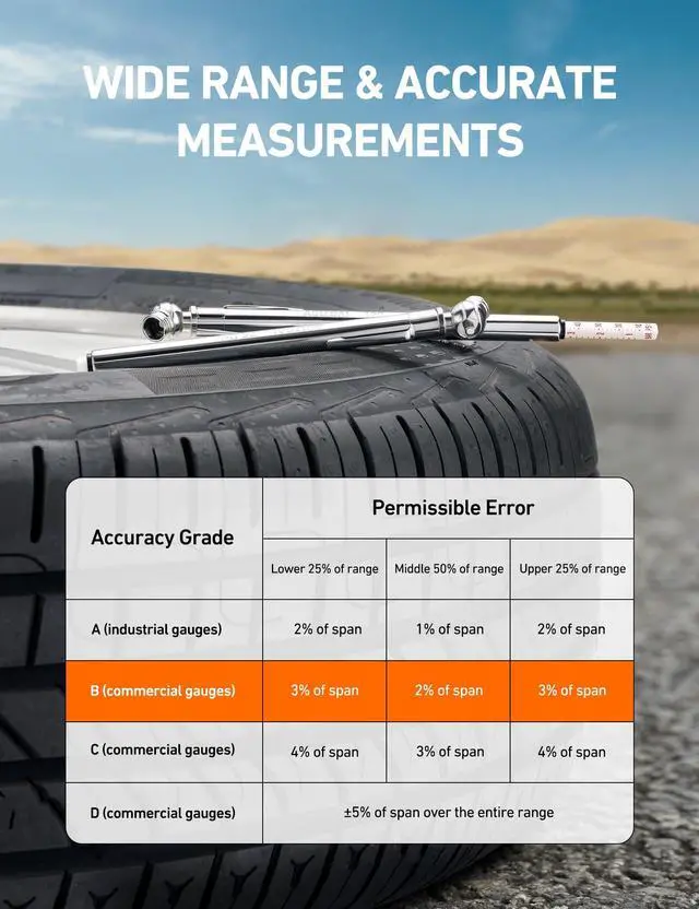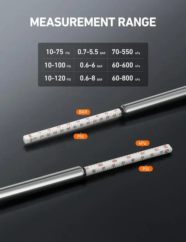 RUGGED DESIGN: The stainless steel components prevent rust and corrosion while the precision-crafted nozzle seamlessly seals onto the valve stems for highly accurate readings (±2% span). We also provide 12 valve stem caps for convenient replacement.