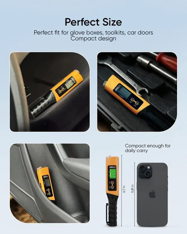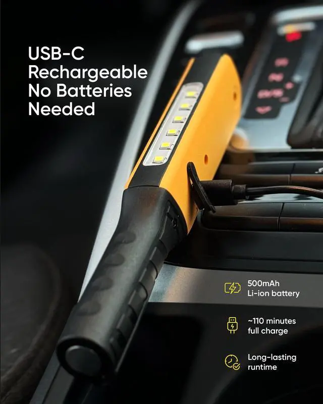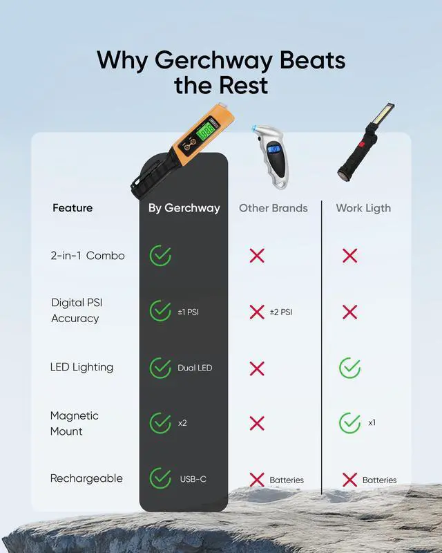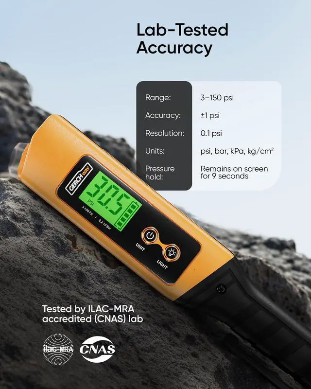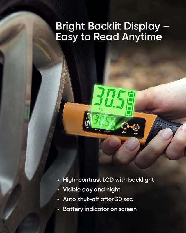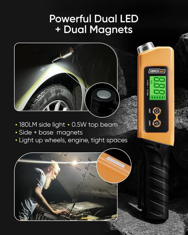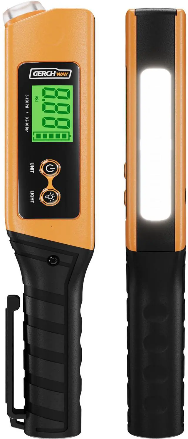 2-in-1 digital tire pressure gauge and magnetic LED work light is built for drivers, motorcyclists, cyclists, and racing enthusiasts who want more from their tools. It accurately measures tire pressure (3150 PSI) with ±1 PSI precision, verified by an ILAC-MRA (CNAS) accredited lab. Choose from PSI, bar, kPa, or kg/cm². Readings stay on screen for 9 seconds after disconnect, and the auto shut-off helps preserve battery life. The built-in 180-lumen side light and 0.5W top beam illuminate dark garages or roadside repairs. Two strong magnets (side and base) let you work hands-free wherever you need light. One button controls the lights, the other powers the display and switches units. Powered by a rechargeable 500mAh USB-C battery, its compact enough to fit in your glove box, saddle bag, or toolkityet tough enough to replace both your old gauge and flashlight. One tool. Two functions. No compromise.