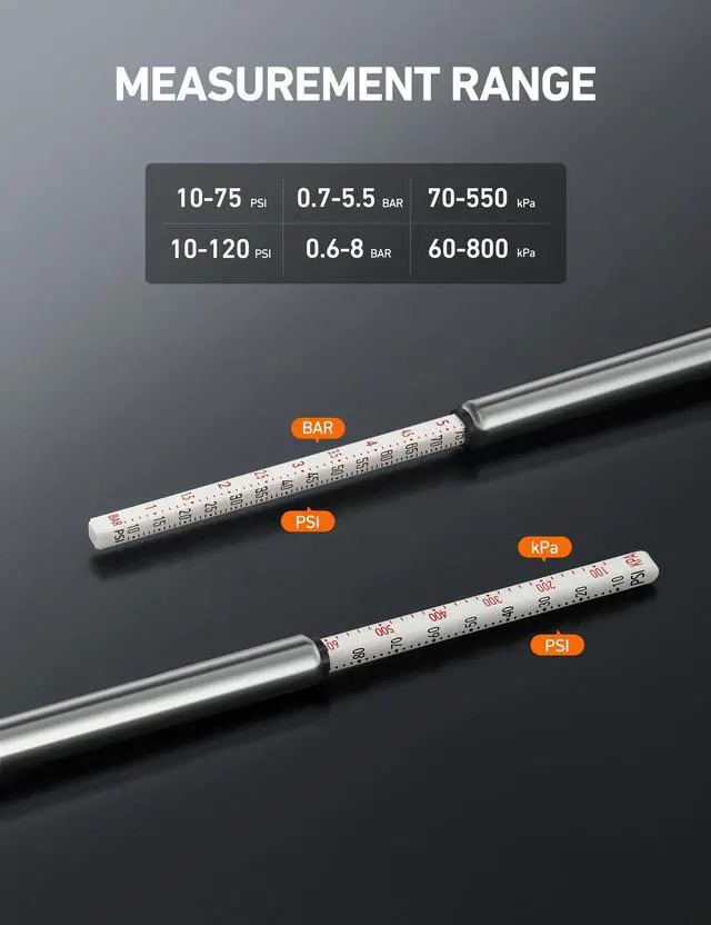 WIDER RANGE: The pressure ranges of 10-75 PSI and 10-120 PSI are designated for their respective measurement scenarios. Please note that exceeding the gauges maximum pressure permanently damages the device.