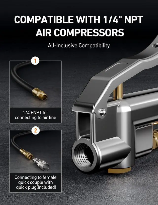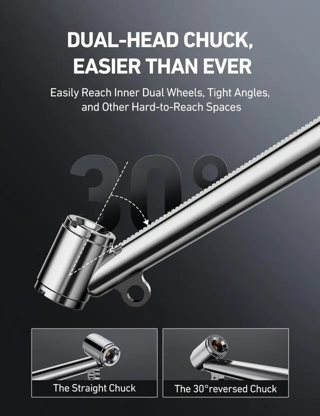 With the 5.31" dual head chuck, the total length of the tire pressure inflator can reach 25.6 inches, which is long enough for daily tire inflation.