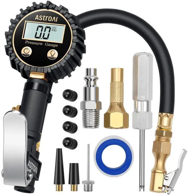 • ALL-IN-ONE FEATURES: The LED backlit screen features measurements in PSI, KPA, Bar, and Kg/cm^2; Includes an inflator, straight locking chuck, gauge, hose, bleed valve, all in one unit, ideal for cars, bicycles, motorcycles, balloons, air cushion, sports balls and so on; Compatible with ¼ NPT air compressors output