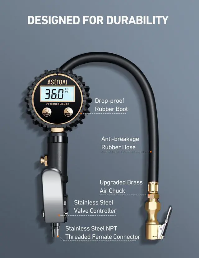 • SUPERIOR CONSTRUCTION: Built of high quality, heavy duty stainless steel and brass components that provide lasting performance; Use for all vehicles, such as Cars, SUVs, Trucks, Motorcycles, Bicycles (with Schrader valve), RVs, and more!