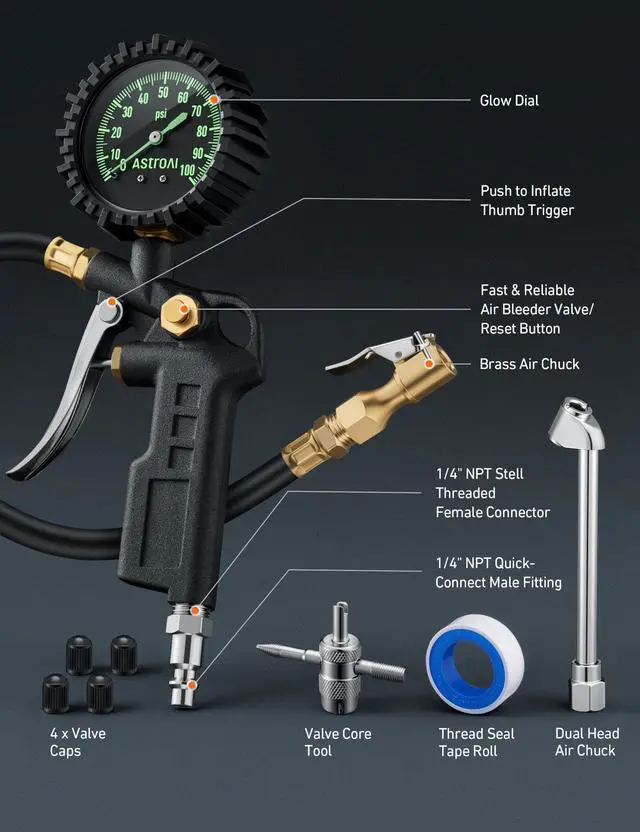 Tire Pressure Gauge with Inflator, 100 PSI-ANSI B40.1 Accurate, Large 2.5" Easy Read Glow Dial, Heavy Duty Air Chuck and Compressor Accessories with Rubber Hose and Quick Connect Coupler